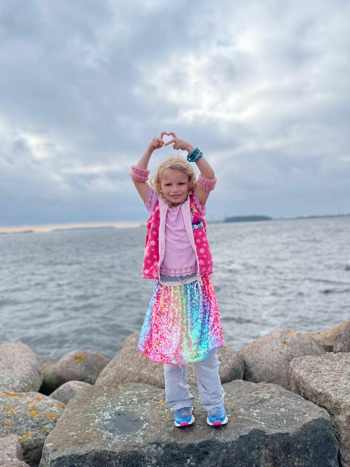 Tämän tuuletuksen myötä tulevat terveiset meren rannalta meren rannalle. Siinä poseeraa syksyn uusi koululainen, Iiris, Suomen Kotkasta.