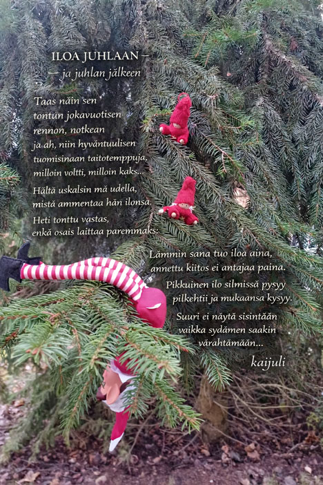 Toivon hyvän joulun tervehdykseni tavoittavan kaikki rakkaat ystävät kesämaassa ja heidätkin, jotka sattuvat sen lukemaan maassa kuin maassa. - Kaijuli.