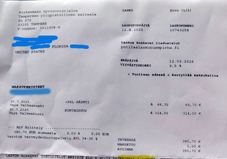 Sairaanhoito tietysti maksaa ja niin ulkosuomalainen sai käynnistä tietysti laskun. Lasku tietysti lähetettiin suoraa tiedossa olevaan ulkomaiseen osoitteeseen. Nykyisellä epävarmalla postin toimitusnopeudella lasku saapui Floridaan muutamassa viikossa.