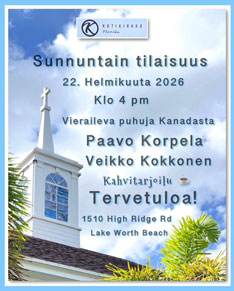 Eino Grönin konsertti: "Laskiaisen Ikivihreää" Paikka: 1800 South Drive, Lake Worth, FL 33462 Päivä: 2/17/2026 Aika: 6 pm Lisää...