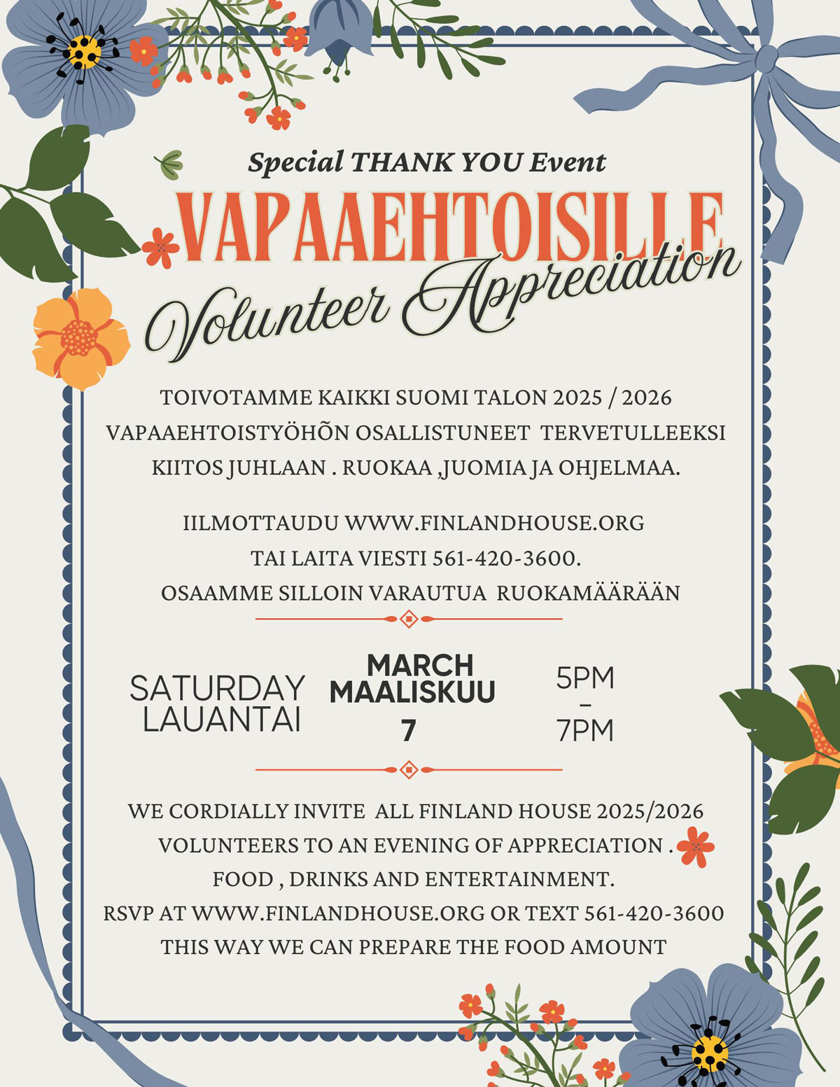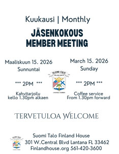 Finlandia Foundation Florida Chapter (FFFC) piti vuosikokouksensa Annan Majalla hyvässä hengessä ja runsaslukuisen yleisön läsnä ollessa. Varsinainen kokous eteni ripeässä tahdissa varapuheenjohtaja Anna-Lisa Jakobssonin johdolla. Esityslista käytiin tehokkaasti läpi, ja kokouksessa todettiin johtokunnan jatkavan entisessä kokoonpanossaan.