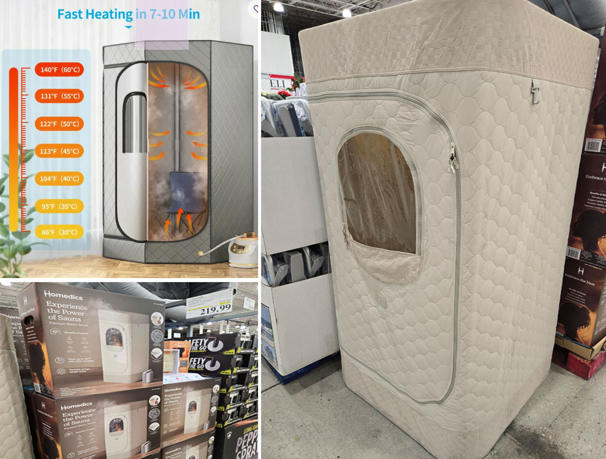 Kaikkea aina ihmettelevä USA:n suomeksi toimittaja törmäsi lähes kirjaimellisesti pikatukkukauppa Costcossa kankaasta tehtyyn saunaan. Samanlainen tuote löytyi edullisesti myös Wayfairin nettikaupasta.