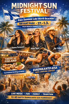 Palm Beach County, FL - 43. vuosittainen Midnight Sun Festival palaa jälleen Bryant Parkiin 27.2.-1.3. - ja tarjoaa jälleen unohtumattoman yhdistelmän suomalaista kulttuuria, musiikkia, ruokaa ja perheystäviä ohjelmaa. Tämä voittoa tavoittelematon tapahtuma tuo yhteen kaikenikäisiä festivaalivieraita nauttimaan Suomen rikkaasta perinteestä keskellä aurinkoista Floridaa.