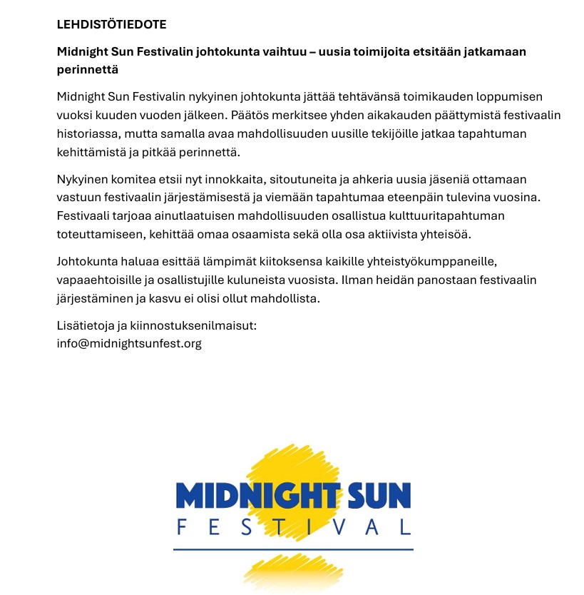 Midnight Sun Festivalin johtokunta vaihtuu – uusia toimijoita etsitään jatkamaan perinnettä