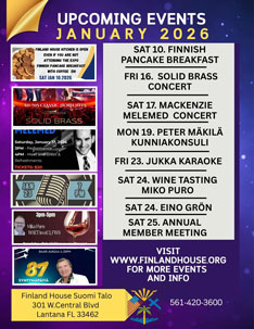 Tammenelehvän Floridan perinneyhdistyksen kuukausikokous Paikka: Annan Maja Päivä: 1/13/2026 Aika: 3 pm Lisää...