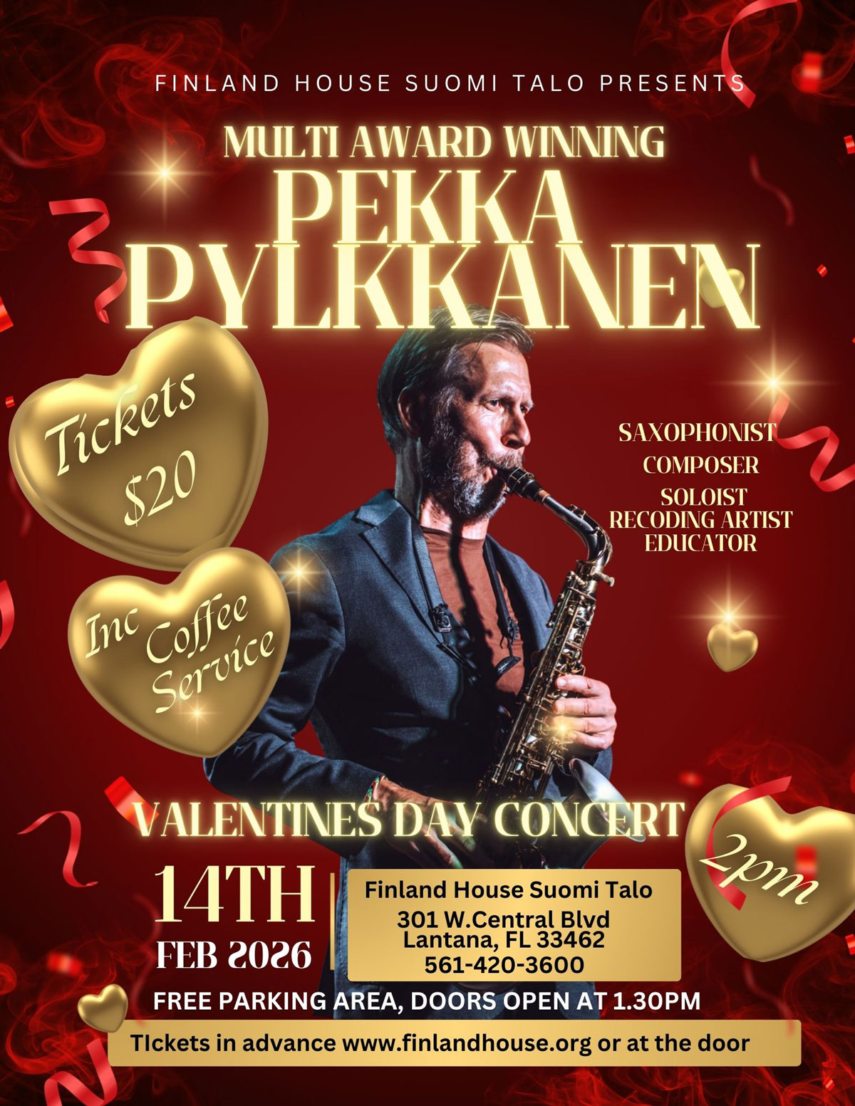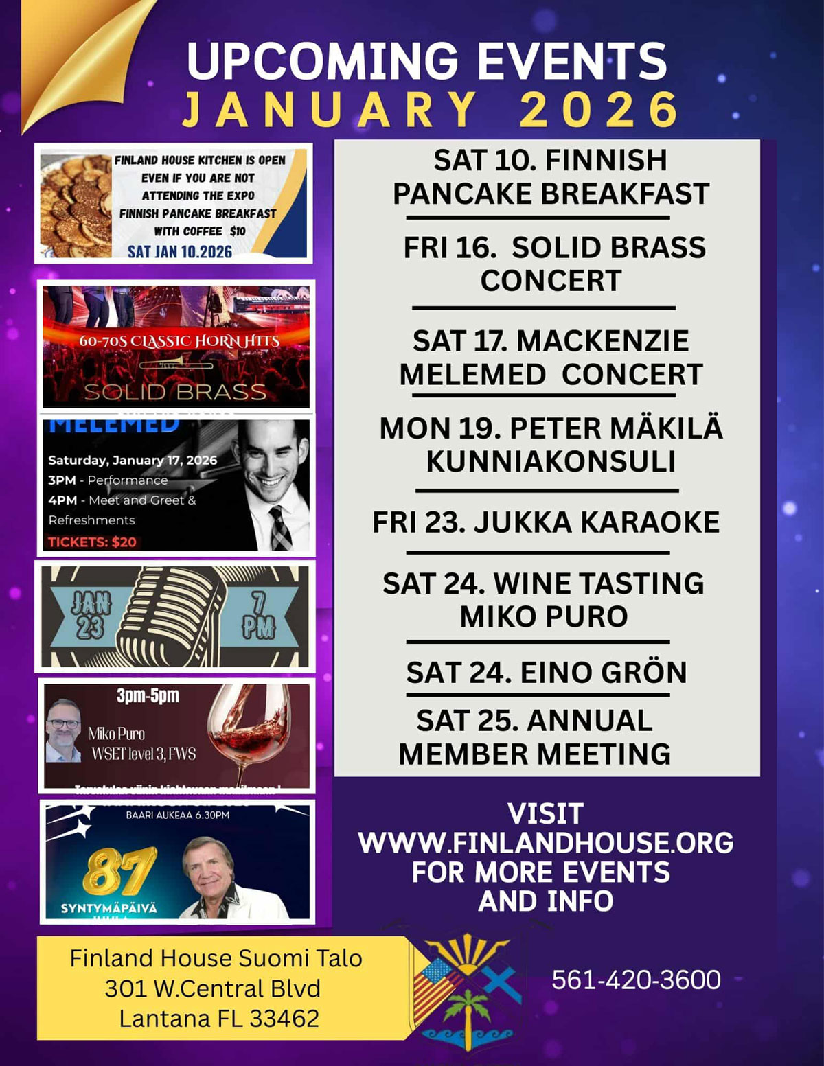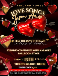 Soita 561-568-1616 (Sal, eng) tai 561-586-0400 (Pirjo, fin) lippujen varaukseen.