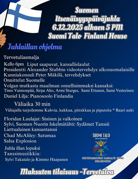 Floridan suomalaiset ottavat Suomen itsenäisyyden 108. vuosipäivän vastaan todella perusteellisesti. Erilaisia tilaisuuksia on aamuaikaisesta iltapimeälle.