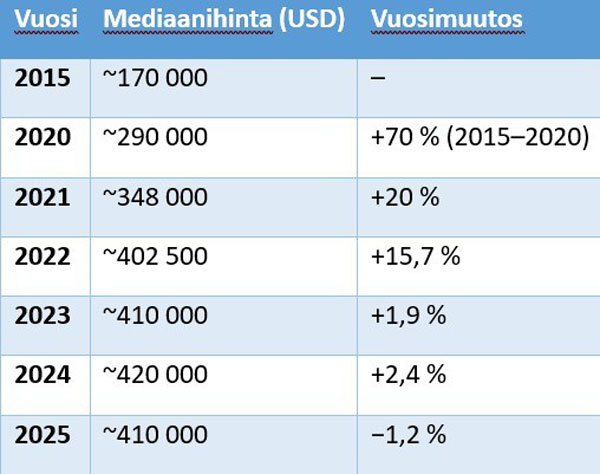 Nousu kuitenkin hidastui selvästi vuoden 2022 jälkeen. Vuonna 2023 hintakehitys oli jo lähes pysähdyksissä, ja vuonna 2025 hinnat kääntyivät osavaltiotasolla lievään, noin 1 prosentin laskuun edellisvuoteen verrattuna.